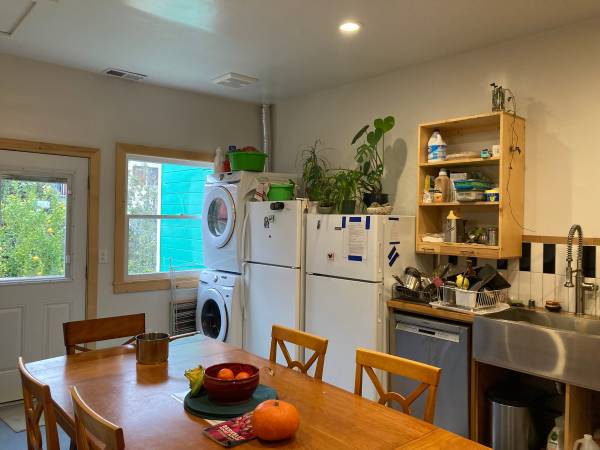Share the apartment with other working adults, range of ages. Sunny outdoor deck, large eat-in kitchen w/2 refrigerators, dishwasher, washer, dryer. Sunny skylight over sitting room, hardwood, tile, and natural flooring, carpet in bedroom. Bike parking in rear yard. Car parking is available on the street. Rent includes all utilities and high speed Wi-fi. Note: Room is small and there is no extra storage.