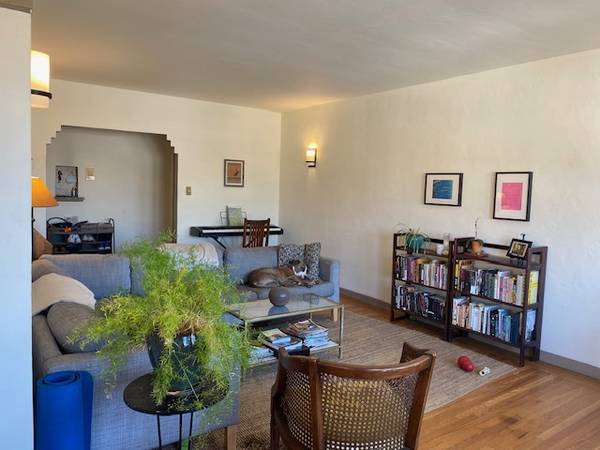 The apartment is beautiful and bright! It's located on the second floor via a small flight of stairs. The majority of the home is furnished with books and plants. The apartment has wooden floors, a lot of natural light, a small balcony, plenty of storage space in the garage, coin-operated laundry in the basement, some shared outdoor space in the back of the building, and very friendly neighbors. The apartment building has four other units everyone gets along well (sharing occasional meals, rotating garbage and recyling, and having each other's backs overall). There is a shared parking spot for the apartment -- which we could alternate.
