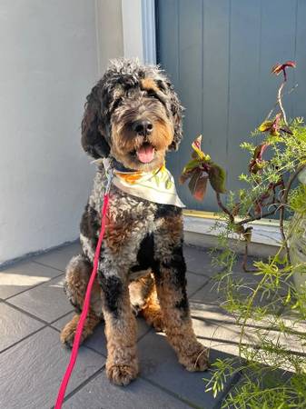 L and D (partners) with their friendly and loving non-shedding bernedoodle, Arlo.