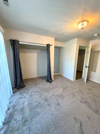 This is the master bedroom which is 14' long and 12'4 wide. There is an 8ft closet and glass sliding door leading to the deck. The deck is only for this unit and overlooks the backyards. The room gets morning sun and has brand new carpet. The room is large, there is space for a queen bed, dresser, nightstand AND desk.