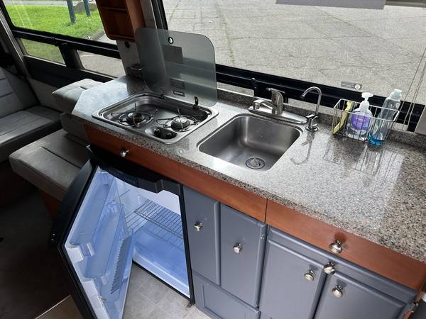 Kitchen: Brew your morning coffee at your two-burner propane stove surrounded by granite counters. The 3-way fridge runs on house batteries, shore power, or propane.