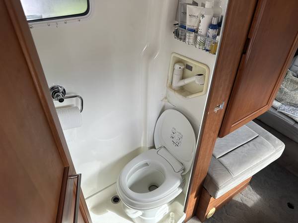 Outside: Enjoy a book or a game of cards under the awning. Rinse the beach sand off at the outdoor shower. The macerator pump makes easy emptying of the holding tanks.