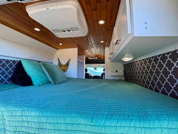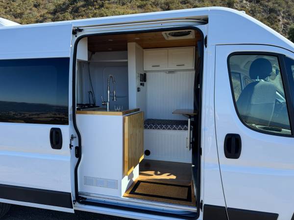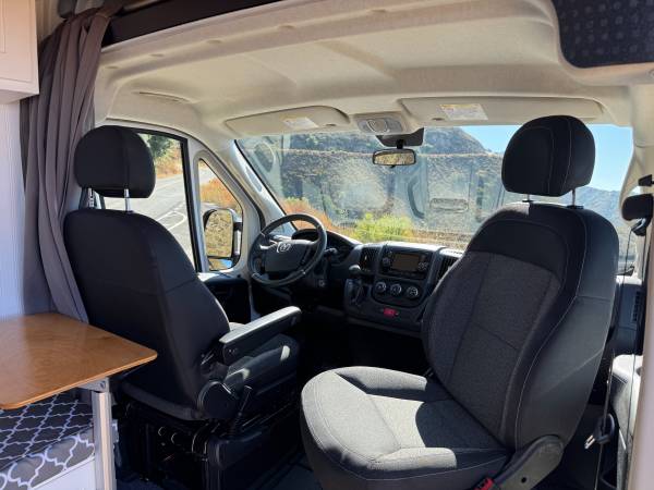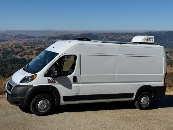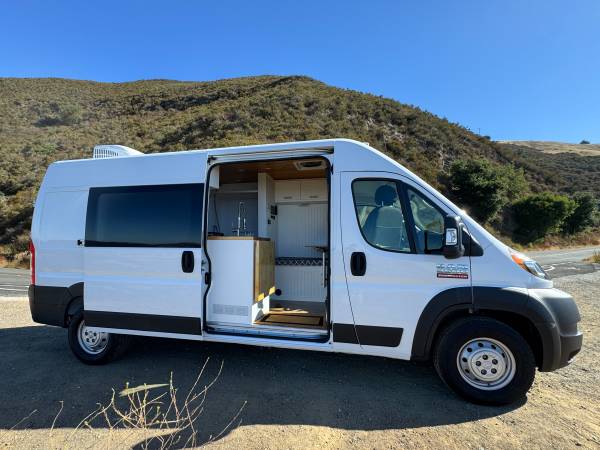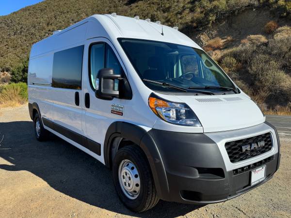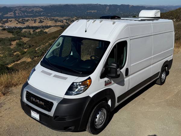 2021 Ram Promaster 2500 159” WB High Roof custom camper van. 22,386 miles with 5yr/60,000-mile Vehicle Powertrain Warranty from Ram in effect. 3.6 L V6 engine, 6-speed automatic transmission, length 236.7 in, width 81.3 (without mirrors.) New dealer-installed transmission with less than 300 miles.