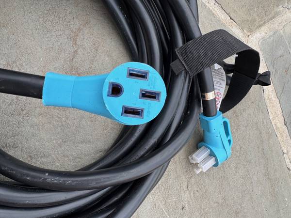Unused 14-50 NEMA Extension Cable, 50 feet long. Heavy duty 1" diameter cable. Includes free 14-50 NEMA to electric vehicle J1772 connector.