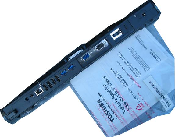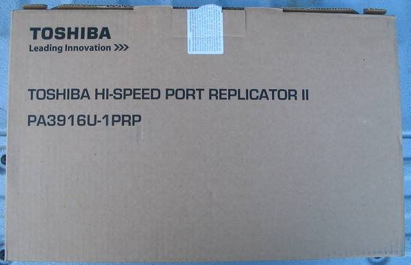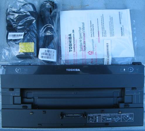 This is a brand new, open box Toshiba PA3916U-1PRP Hi-Speed Port Replicator II. This was procured for the Toshiba laptop we had, which promptly died before we had the chance to use the docking station. Our loss is your gain! In the box is the power cord & power supply (wall wart aka genuine Toshiba 19V/4.74A power adapter), the manual, and the dock.