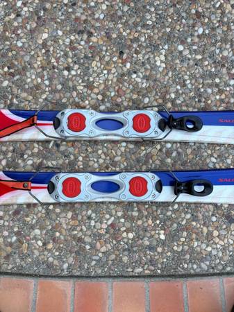 Selling this set of Salomon Snow Blades 99 cm Mini Trick Snow Blade / Snow Board short all mountain snow skis with adult size adjustable bindings for only $120 for the set.