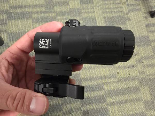 EOTech sight holographic sight circle with 4Reticle for distance with 3x magnification for distance, magnification that can drop to the side for CQB with vertical offset. Bought it years ago (2016) and never used it until I mounted it once on an AR and realized my astigmatism blurs the sight rendering the dots unusable. Since then it's been sitting in the original case unused and forgot about it. Just recently found it again.