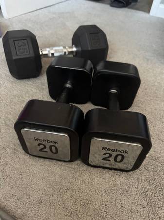 Dumbbells: Pair of Reebok 20 lb square dumbbells / one 35 lb dumbbell Pair of Rare Reebok Square 20 lb dumbbells $60 One 35 lb dumbbell (purchased from target) $30 $75 for all 3 dumbbells