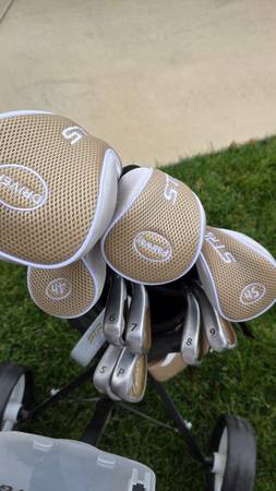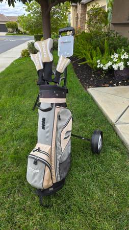 Like new condition: Callaway Strata 19 piece full set Fits women 5'4"-5'11" 4H 5 H 6, 7, 8, 9 Irons Pitching Wedge Sand Wedge Blade Putter 4 Head Covers T's Balls Push Cart