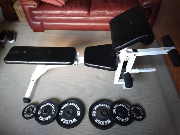 Weider weight set and weight bench. (2) 33 lb weights (2) 22 lb weights (2) 5 1/2 lb weights $150.00 OBO