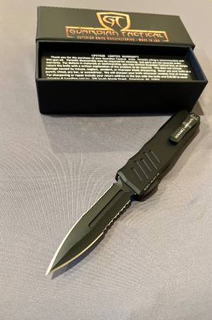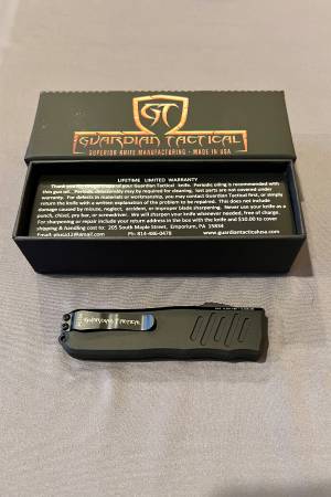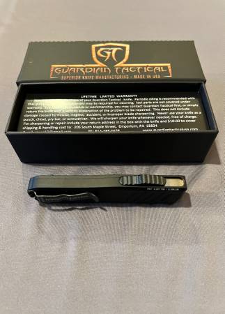 Selling a Guardian (GT) Recon-035. It is brand new in box, total and absolute mint condition. Never used, cut, carried or even fidgeted with. Lifetime warranty (including free sharpening) through GT. 100% USA made. Specs: Black cerakoted 6061-T6 milled aluminum body with black DLC (Diamond Like Carbon) Elmax ultra premium stainless steel hollow ground blade. Black type-3 anodized activation switch, hardware and pocket clip. Pocket clip is reversible. Blade length is 3-3/8”. Handle length is 4-1/2”. Overall length is 7-7/8”. Weight is 3.5-oz. GT can verify authenticity via its laser engraved serial number (#12606). The activation switch rides on a stainless steel plate with 3 ceramic ball bearings that eliminate wear and tear. GT’s innovative locking mechanism is placed off center from the blade channel to avoid drag against blade when operating the action. Can meet buyers in Livermore, San Ramon, Dublin, Danville, Alamo or Walnut Creek. Free shipping offered for out of area buyers. Feel free to contact me with any questions via Craigslist messaging system, email, phone call or text. If this posting is still up, it’s still available. Thank you for your consideration.