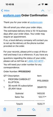 PROFORM CARBON E7 ELLIPTICAL Perfect condition! It’s a really great machine, but with 2 kids I no longer have room for it. It works great and is in like new condition. It’s been kept in a house, not...