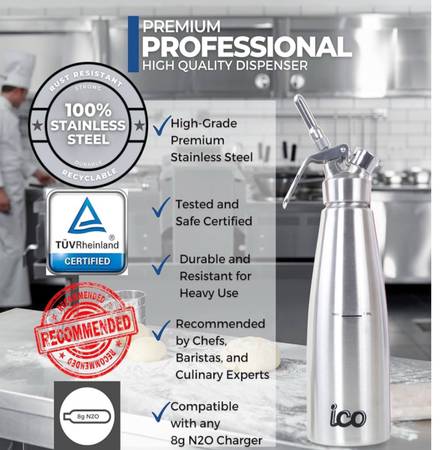 Selling a brand new, never-used ICO whipped cream dispenser in original packaging. Ideal for making fresh whipped cream, mousses, foams, and more. Compatible with all 8g N2O chargers.