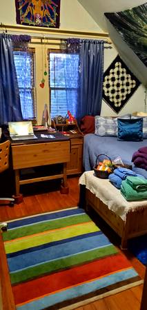 A private upstairs fully furnished room (11x12) with everything you need away from home including quality bedding and towels. It has great energy with beautiful hardwood floors, and unique slanted ceiling with tapestries. Great quiet space for studying or retreat!