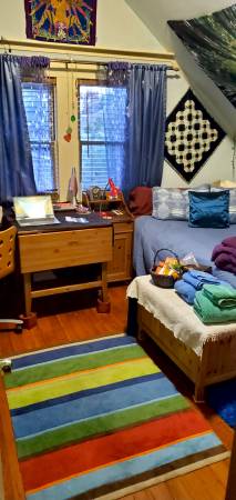 A private upstairs fully furnished room (11x12) with everything you need away from home including quality bedding and towels. It has great energy with beautiful hardwood floors, and unique slanted ceiling with tapestries. Great quiet space for studying or retreat!