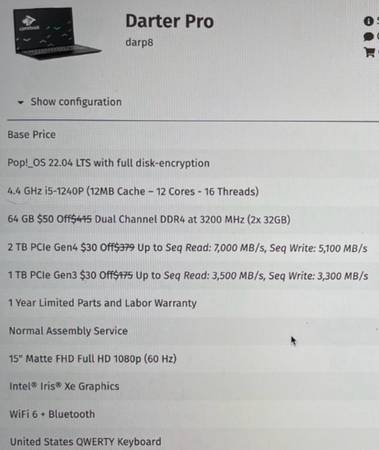 Intel Core i5-1240p 64 gb ddr4 ram (dual channel) Samsung 980 pro 2 tb Samsung 970 evo plus 1 tb Excellent condition, frequently cleaned and repasted with Honeywell PTM7950.