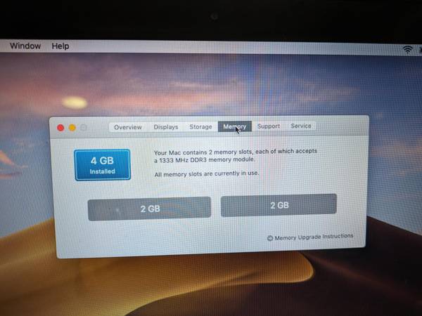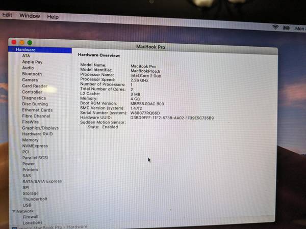 Apple MacBook Pro Unibody 13" A1342 C2D 2.4 GHZ 4GB RAM 500 GB HD Operating System upgraded to Mac OS Mojave. NVDIA GeForce Graphic Processor for Vibrant Pictures and Video playing. Even though it is core 2 Duo, but it's performance is fast. Item is in excellent condition with no scratch on top, bottom body, palm rest and LCD. Battery condition is also good and hold charge. Comes with Original Apple Mag Safe Charger. This Model MacBook has DVD/CD slot for viewing and recoding DVD/CD