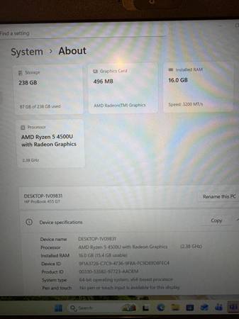 I have an HP Probook 455 G7 laptop for sale. Overall in excellent condition. Passed all onboard diagnostics. Windows 11 and Office 2013 freshly installed and ready for the next owner.
