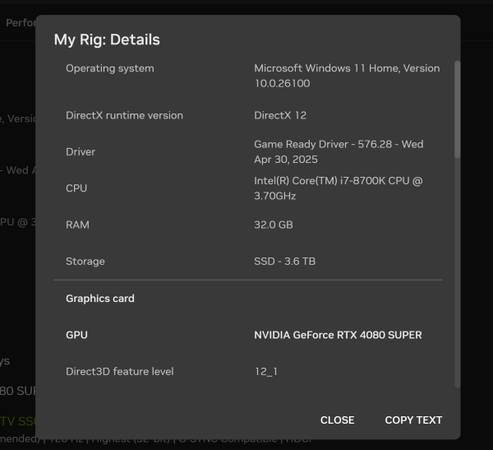 - NVIDIA GeForce RTX 4080 SUPER 16GB FE (founders edition) - Intel(R) Core(TM) i7-8700K CPU @ 3.70GHz - liquid cooled CPU - extra case fans added - 32GB ram - 4TB m2 ssd - 750w PSU - Corsair case -...