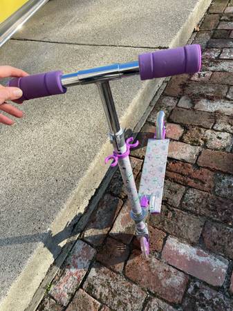 Metal 2-wheel scooter in good condition. Purple with butterfly accents. Good for kids 3-5 years old.