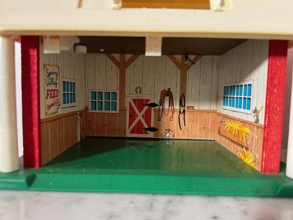 1 horse, 1 harness, 1 cow, 1 trough, 1 brown farm dog, 1 black pig, 1 red rooster, 1 white hen, all pictured. No original box. Accepting Cash, Venmo, or Zelle. Door pick up.