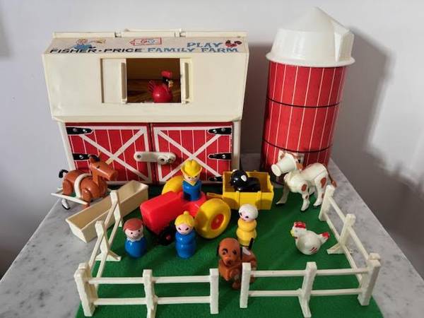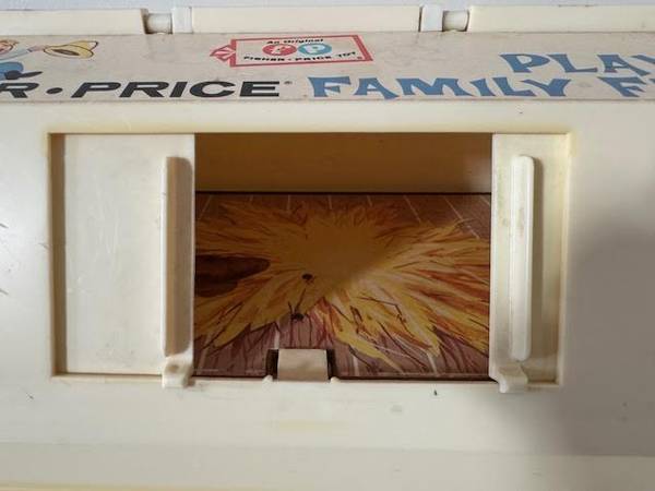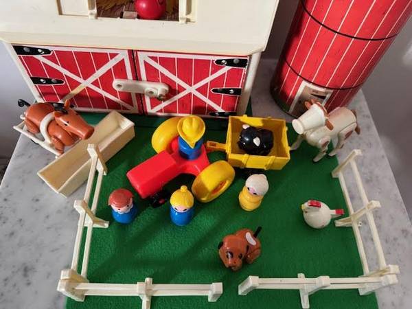 What a memorable, durable vintage toy! The MOO-ING barn doors still work when opening or closing! Farm life was captured by Fisher Price and this set was well preserved, from a smoke-free home. The set includes a red and white barn and silo. Sound video is available by request/text. Pieces included are: