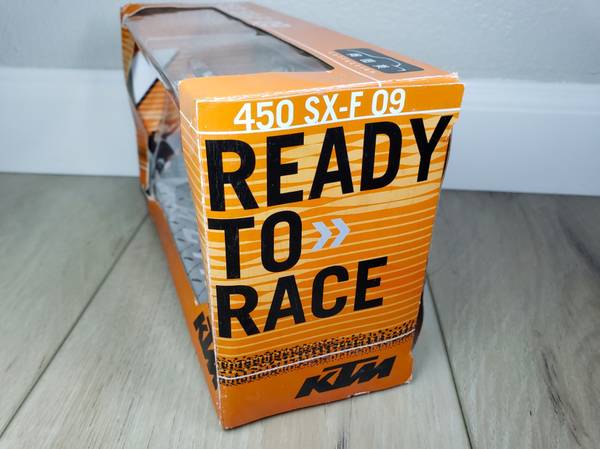 New large size 1:12 scale KTM 450SX-F. Incredible detail with articulating suspension, wheels, and steering. The model is new in the box, but the outer box has wear Official KTM licensed model....