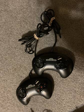 Original Sega Genesis model # 1601 with two remote controls, power source, front switch, multiple cords/connectors and Joe Montana poster inside game gear pamphlet
