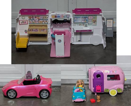 Vehicles from Barbie line What you see in the picture is what you get. There's some missing accessories. Barbie Club Chelsea Camper - $20 Barbie Convertible Toy Car, Sparkly Pink 2-Seater with...