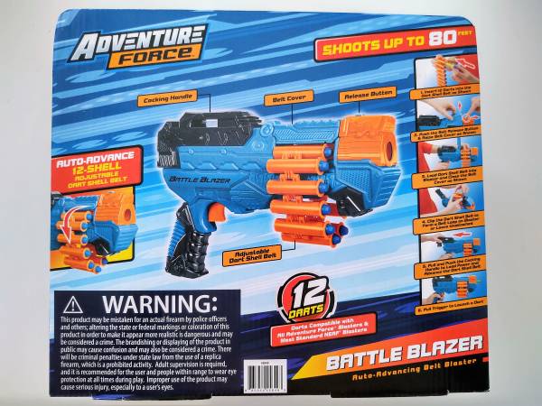 Adventure Force Battle Blazer allows for continuous dart blasting action. Fill the 12 round dart belt with darts and load it into the blaster; pull back the top handle and squeeze the trigger to launch your dart up to 80 feet. Includes one 12 round dart belt that will keep you in the action longer. The dart belt is adjustable for various lengths so you can customize your round size. Item comes with dart blaster, 12 long distance darts and dart belt. Recommended for children 8 years of age and older.