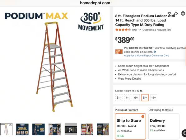 ⑤Werner 8 ft. Fiberglass Podium Ladder with 14 ft. Reach and 300 lbs. Load Capacity Type IA Duty Rating,$ 170