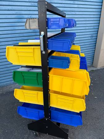 Solid powder-coated steel frame, on four casters; 2 fixed, 2 swivel, and a handle. Includes approximately 50 bins of various sizes. Selling due to downsizing. I have two too many. ULINE priced at...