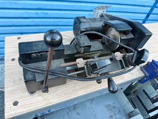 RYTAN Locksmith key cutter, fully operational, mounted to an Adrian Steel Co. 7-Drawer van workbench. Includes WINTON bench vise.
