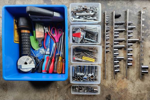 Blue bin of misc Ruler, flashlight, screwdrivers, stapler, scissors, etc. Small bin of wrenches. Metric and standard. Small bin of hex wrenches. Small bin of various driver bits A bunch of sockets...