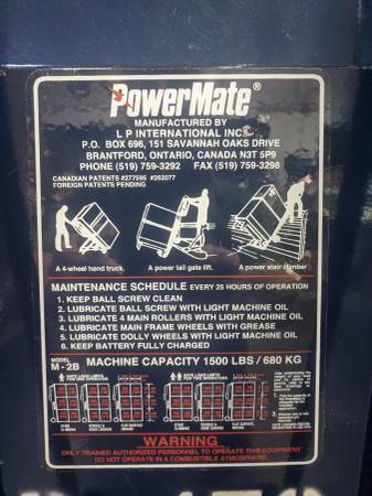 Powermate M2B battery powered stairclimbing hand truck. In excellent condition with new battery and charger. Has 2 extras, the wheel brake shoes and extended toe plate. No calls after 9pm please. More information on specs https://www.powermate.info/powermate_handtruck_m-2b