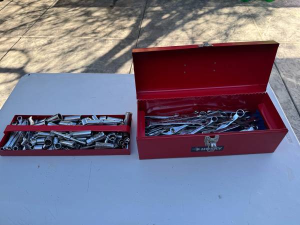 Toolbox for sale with assorted tools. Includes various sizes and brands of wrenches and sockets. Everything in good working condition.”