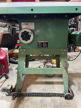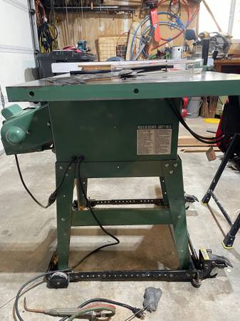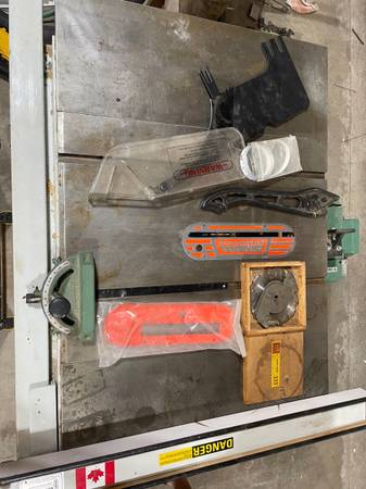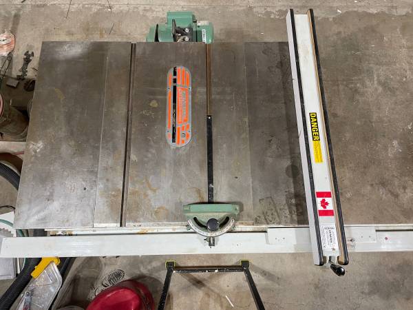 The saw weighs approximately 300 pounds and features a 10-inch blade with a maximum rip capacity of 30-3/8 inches.