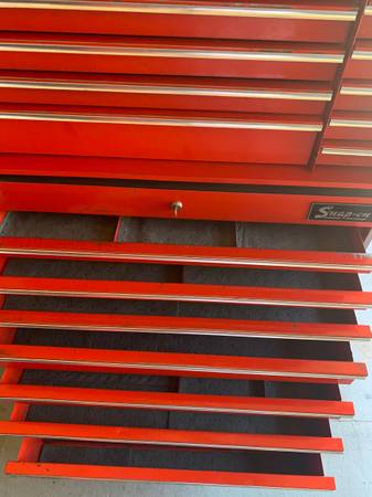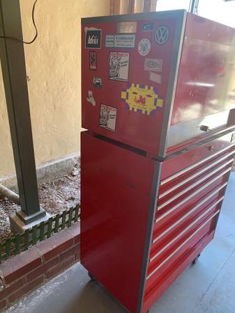 Vintage Snap-On KR537 & KR557 Roll Cab & Flip Top Combo Red Made In USA 1973 Matching Years. Measures 35'' Wide x 56-1/4'' High x 18-1/4'' Deep. Unit has cosmetic blemishes from age or use but in good working condition. Unit comes with 2 Keys. 1 key locks the roll cab and the other key is for the flip top. Unit has scratches, small dings. All drawers slide work as they should. Unit is in great condition for a 51 year old box. It’s getting harder and harder to find these in this condition. Pick up in Vallejo.