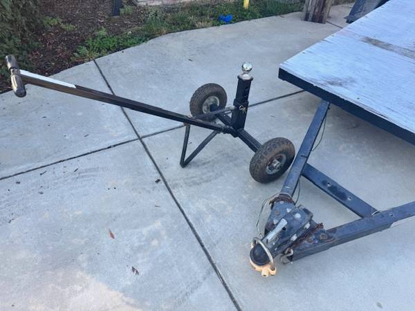 Condition: The tires are original. They do hold air pressure. The chassis paint is faded, and there’s some surface rust. The safety chains and attaching hardware are pretty rusty and should be replaced prior to hauling any appreciable weight. The paint on the 3/4" plywood deck is cracked and faded. The trailer dolly shown in the photos is included.