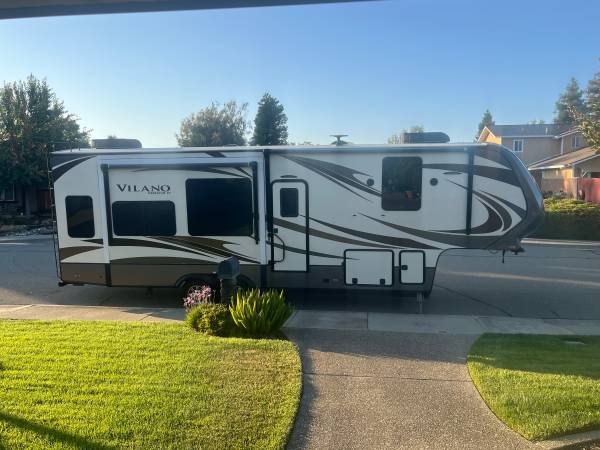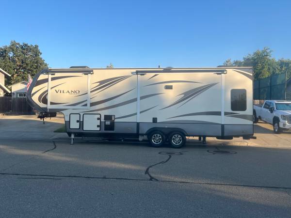 2018 Vanleigh Vilano 5 th wheel travel trailer,3 slide with toppers,2 power awnings,2 tvs,18 cf refrigerator/freezer, Cummins onan 5500 generator,54 gals fresh water,45 gals grey water,45 gals black water tanks, leaving all necessities(hoses,cords,dishes, ect.rear facing camera with wireless monitor for cab, and alot more..One owner in great condition.