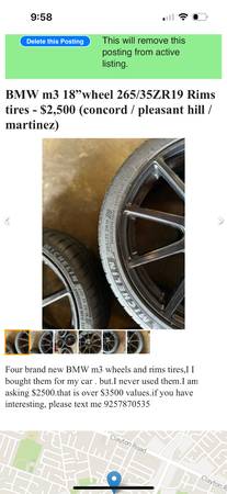 New 19”wheels 265/35 ZR19 rims tires.I bought them a few years ago, never used them,.I asking $1550,Its Value is $3500 .text: