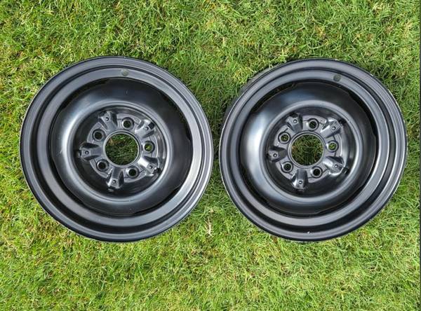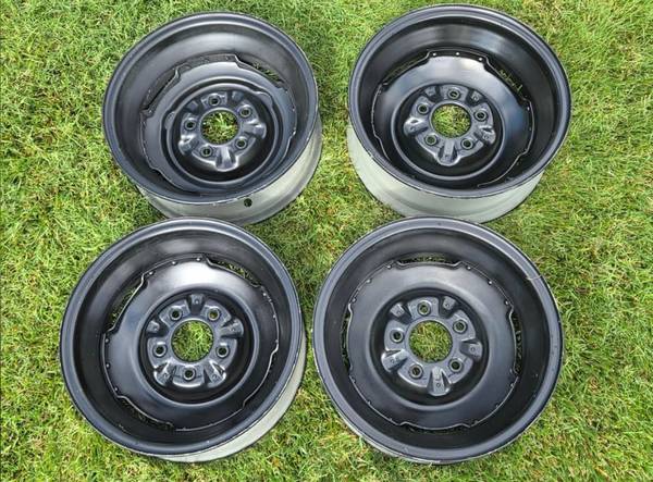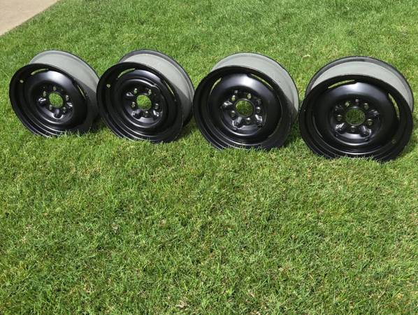 I have up for sale a set of (4) Chevy/GMC stock steel wheels. These are 15 inch diameter, and are 5 on 4-3/4 in. bolt pattern. Typically used on cars in 50's, 60's and 70's era. Will fit many Chevy, GMC, Pontiac, Oldsmobile, and Buick makes. These were painted satin black some time a while back. 2 of the wheels have all the clips, and two wheels are missing clips. Aftermarket clips can be added on fairly easily. These are old school american made steel- not from china... Selling all 4 together as a set for $450 (FIRM )... Pick up in Fremont.