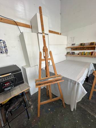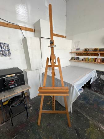 Two solid wood free standing easels with adjustable trays and adjustable as to angle. One easel has upper picture stay, one does not.