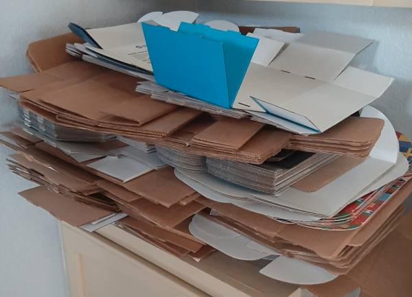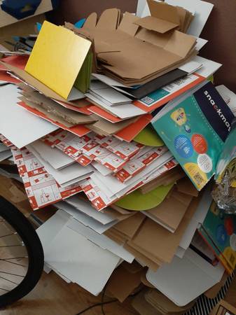 3 stacks of fold-able boxes of various sizes. they fold into a box like in the pic. boxes have some sort of logo/ad/shipping label on them.