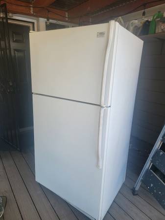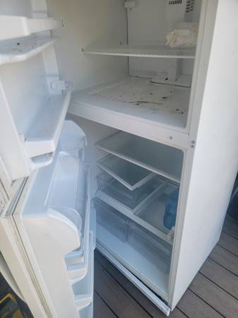 Full-size Estate refrigerator/freezer combo. Still powers on and works fine, but it could use a deep cleaning. Good for a garage, backup, or rental property. Price: FREE just pickup yourself....
