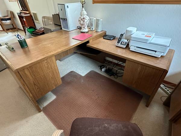 Free desk, worktop and credenza. Woodgrain Formica finish in excellent shape. Terrific workspace. Desk is 30”x60”, computer return is 42”x21”, credenza is 72”x21”. Great for a home or business office. Small chip on edge of desk.