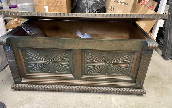 Well-made wooden chest with interior storage space. Antiqued finish fearuting a sunburst motif on front panels, It does have a few knicks but is overall in good shape. Chest is 46" wide, 23" depth, and 22" height. It is fairly heavy so whoever picks up must be able to manage loading. Missing one part of interior hardware which prevents top from opening too far, part should be available at hardware store.
