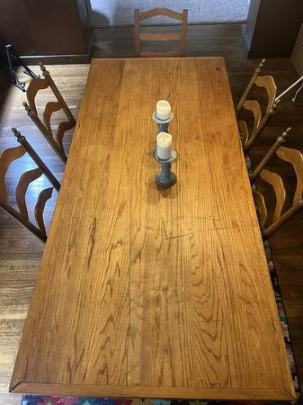 Title says it all: big, sturdy dining room table with character. We bought it for $300 at Urban Ore about a year ago; it's a little beat up in some spots (see photos), but if you're handy, you could definitely restore/refinish it to great effect. Comes with lots of good vibes from many dinners with dear friends.