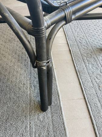 This black rattan (wicker) chair is in good condition - see photos for the two places the wrapping is coming a little loose. Cushion comes with but we also used cushions that matched our decor like from the sofa. It looks great. A statement piece. Combining households and don’t have room.