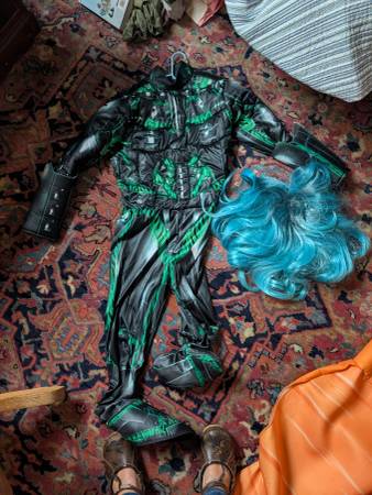 Some sort of super hero or something that I should remember. Has some nice muscle definition. Fit my 11; year old last year. Goes with the mask. Still don't remember what it is.
